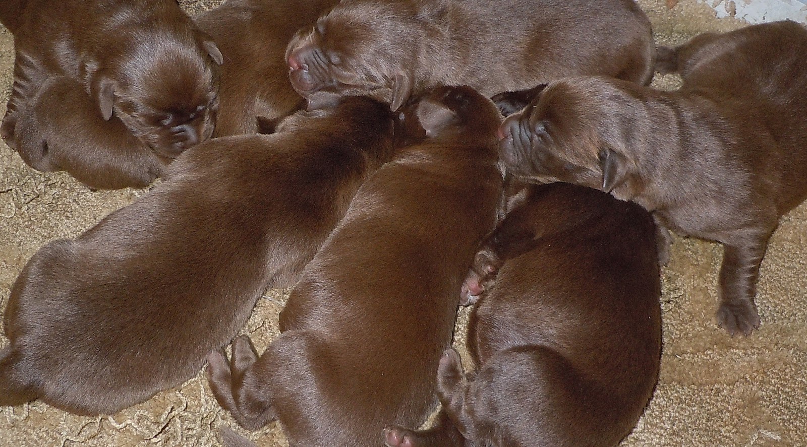 Wanted to let you know that we have a litter of Chocolate Lab Puppies being born as I type this!! Our dog "Fudge the 3rd" is in labor since 5:00 this morning! So far she has 5 chocolate. It's now 10:15. Not sure on the gender yet. I'm going to be posting pix of a Male and Female from recent litters, and also of the Mother "Fudge". I'm excited to see if there's any more on the way, but want to let her go for now. They all 5 look very healthy, and she's taking great care of them so far. PTL! Check back for more updates!!